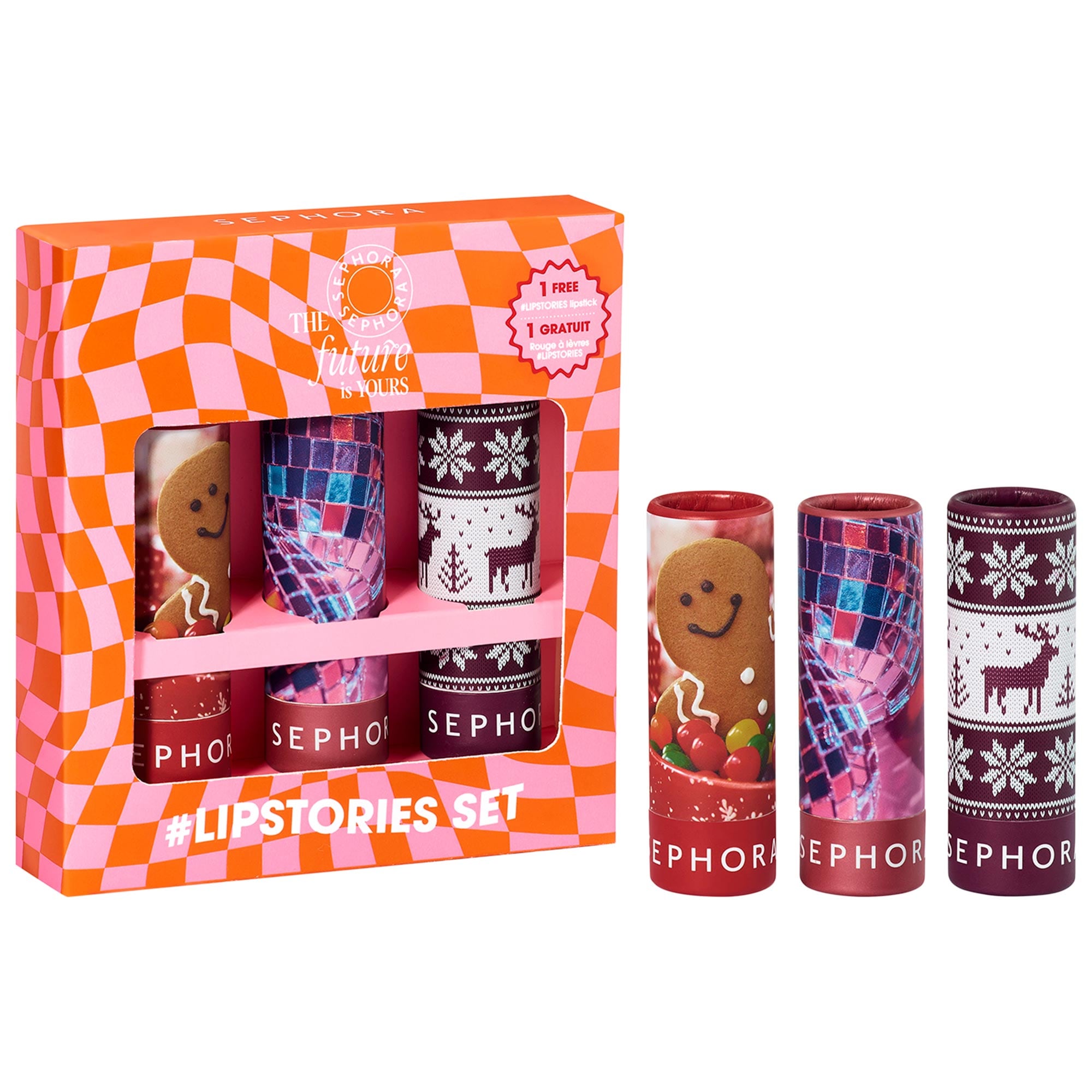 - 3 x 0.14 oz/ 4 g #LIPSTORIES in 106 Naughty Or Nice (Classic Red), 107 Let's Celebrate (Rosy Shimmer), 108 Sweater Weather (Deep Berry)