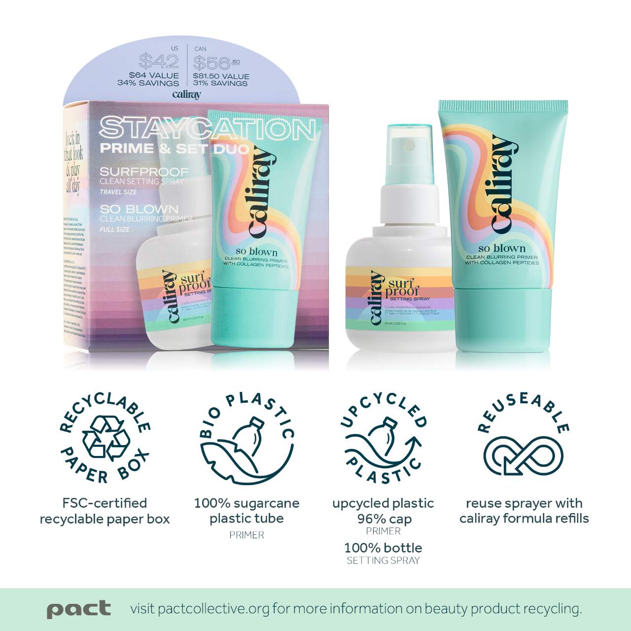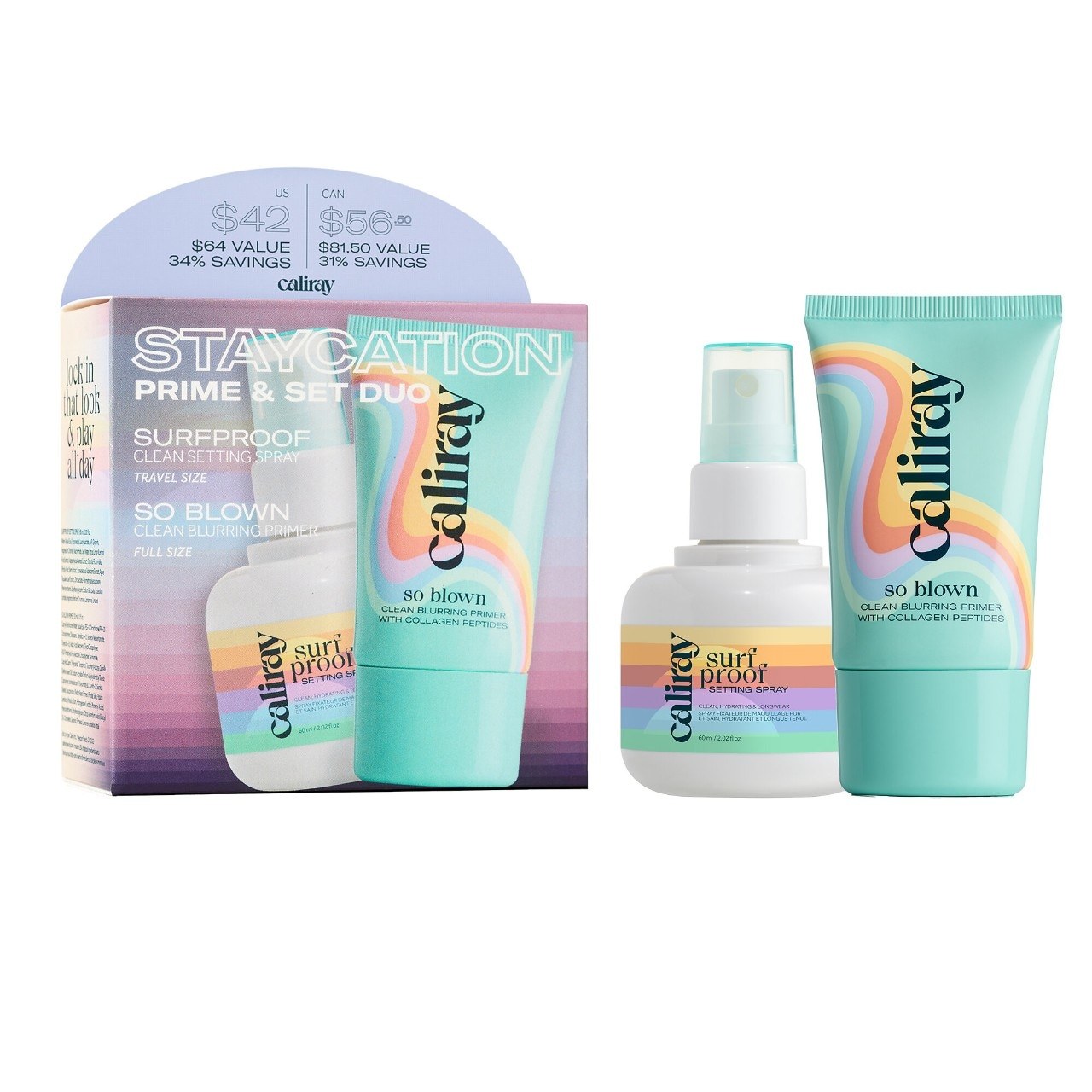 What Else You Need to Know: Staycation, the limited edition prime-and-set dynamic duo, includes So Blown Primer, a clean, blurring face primer with hydrating niacinamide and visibly plumping collagen peptides that delivers a soft-touch, silky feel and a poreless matte finish, and Surfproof Setting Spray, a long-wearing, lightweight, no-transfer, clean setting spray with an ultrafine mist that delivers bouncy hydration and a natural finish. When used together, they complement any makeup look.