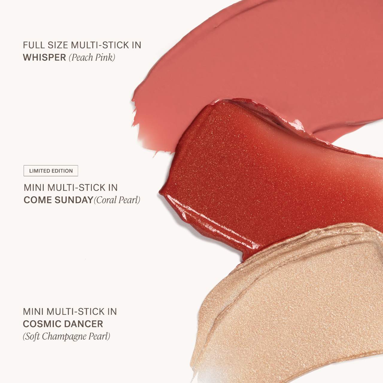 What it is: A limited-edition multi-stick trio in two bestselling shades, Cosmic Dancer and Whisper, and one exclusive new hue, Come Sunday.