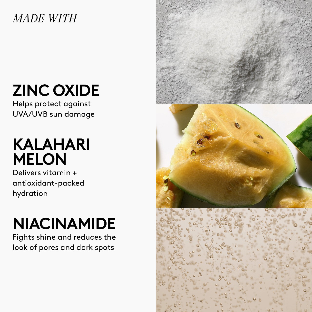 - Niacinamide: Fights shine and reduces the look of pores and dark spots.
